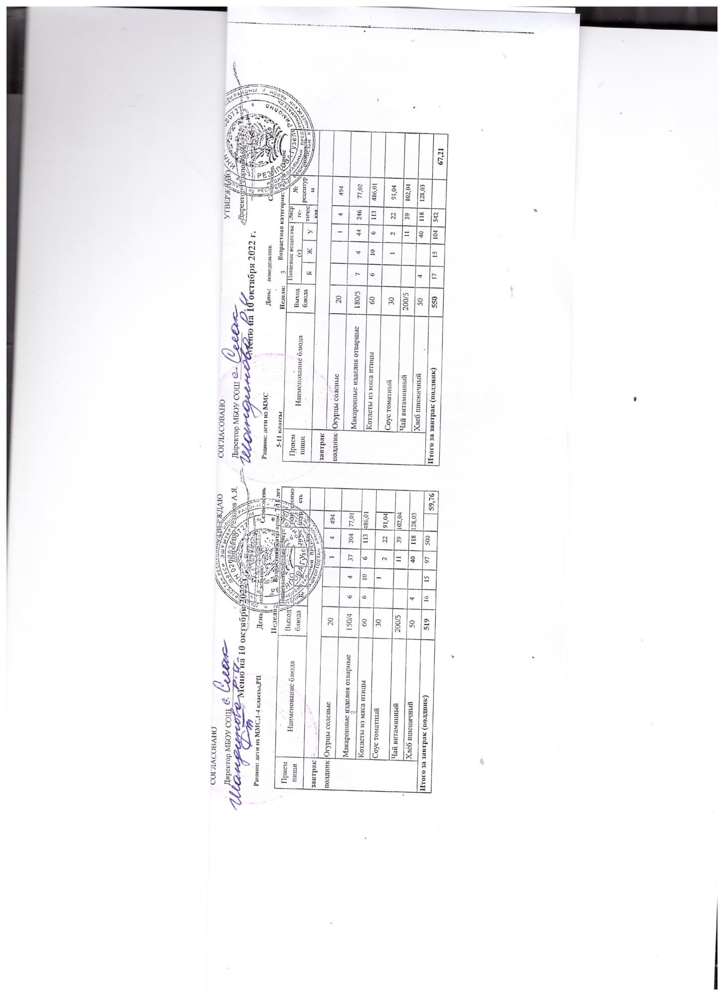 (контрольное меню на 10.10.2022 завтрак многодетные и ОВЗ завтрак)