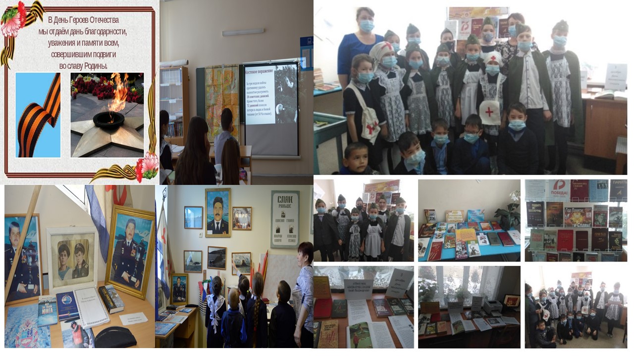 В нашей школе проведены мероприятия ко Дню Героев Отечества: единые уроки и классные часы, показ фильмов и презентаций, экскурсия в школьный музей, выставка книг о героях в библиотеке школы.